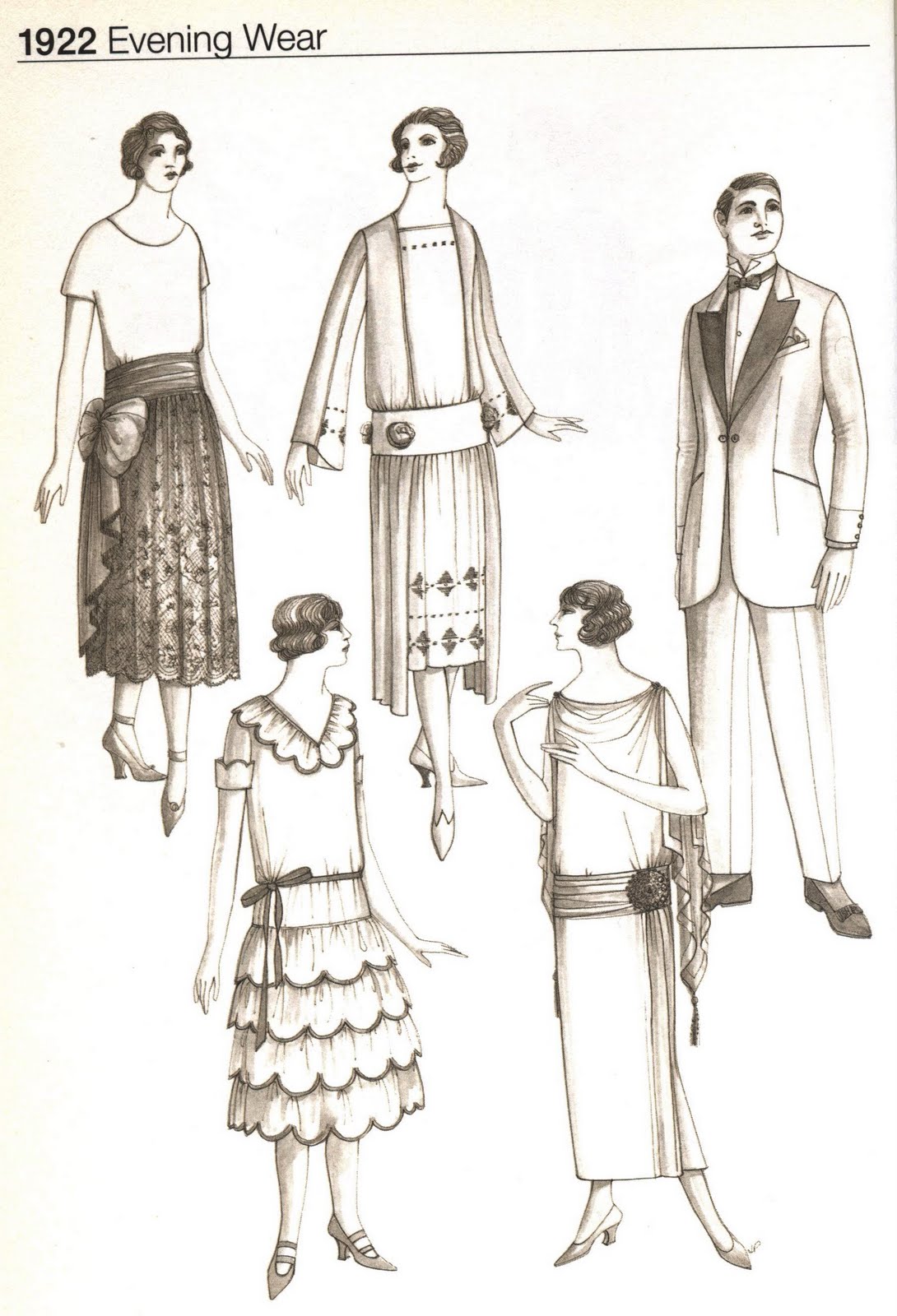Next month I'm going to celebrate my completing 30 years of life with a 1920s party! Planning is underway and I'm very excited. I have a dress pattern and material to make my party dress, the hall is booked and loads of ideas are swimming in my head. I thought I'd share some fashion pics sketched by John Peacock in his fashion sourcebook "The 1920s" that I borrowed from the local library.
